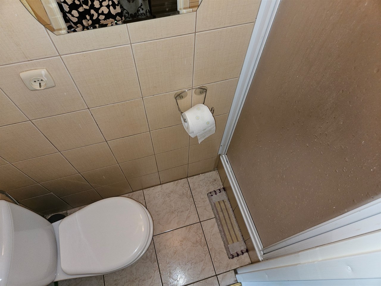 - Łazienka z toaletą: Mała, wyposażona w kabinę prysznicową