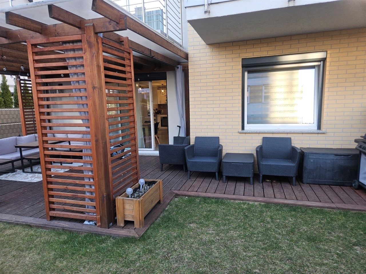 Do mieszkania przynależy przestronny ogród o powierzchni ok. 200 m² z bezpośrednim wyjściem na duży, zadaszony taras.
