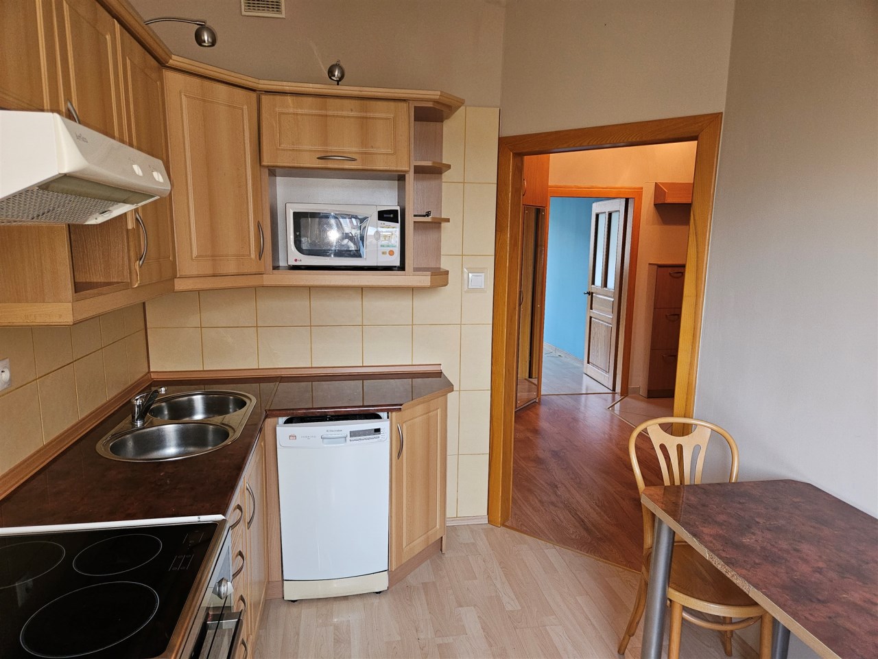 Kuchnia wyposażona w sprzęt AGD: zmywarka, mikrofala, lodówka, kuchenka elektryczna, okap.