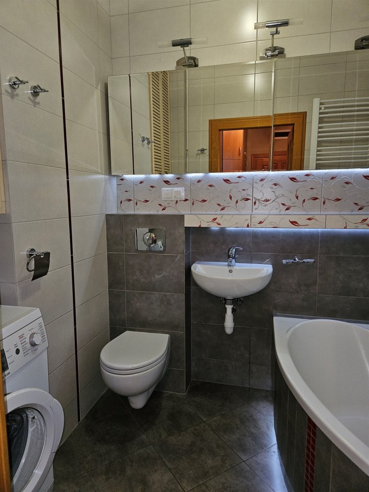 Łazienka duża. Wanna, pralka, szafki.